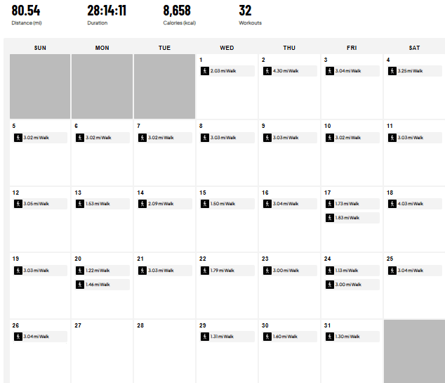 Mileage: I walked 80.5 miles in January and only missed two days where I didn’t walk at all. Those were travel / meeting days for me where I lost time (literally from crossing time zones) and just needed to sleep.