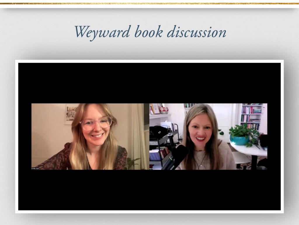 Last weekend I caught up on some of the Modern Mrs. Darcy book club events I’ve missed over the last few weeks. The first was the chat between Anne Bogel and author Emilia Hart about her debut novel, Weyward. I finished the book earlier this year and I was fascinated to learn about Emilia’s inspiration and writing style. It is told from three different women’s perspectives and weaves their stories together over centuries: modern-day Kate, 1940’s Violet, and 1600’s Altha (on trial for murder).