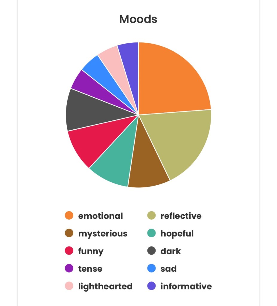 A few months ago, my friend told me about StoryGraph and I shared my intentions of tracking my reads! I am loving the stats and visualizations so far in 2025. You can follow me at East Bay Bookshelf on StoryGraph!