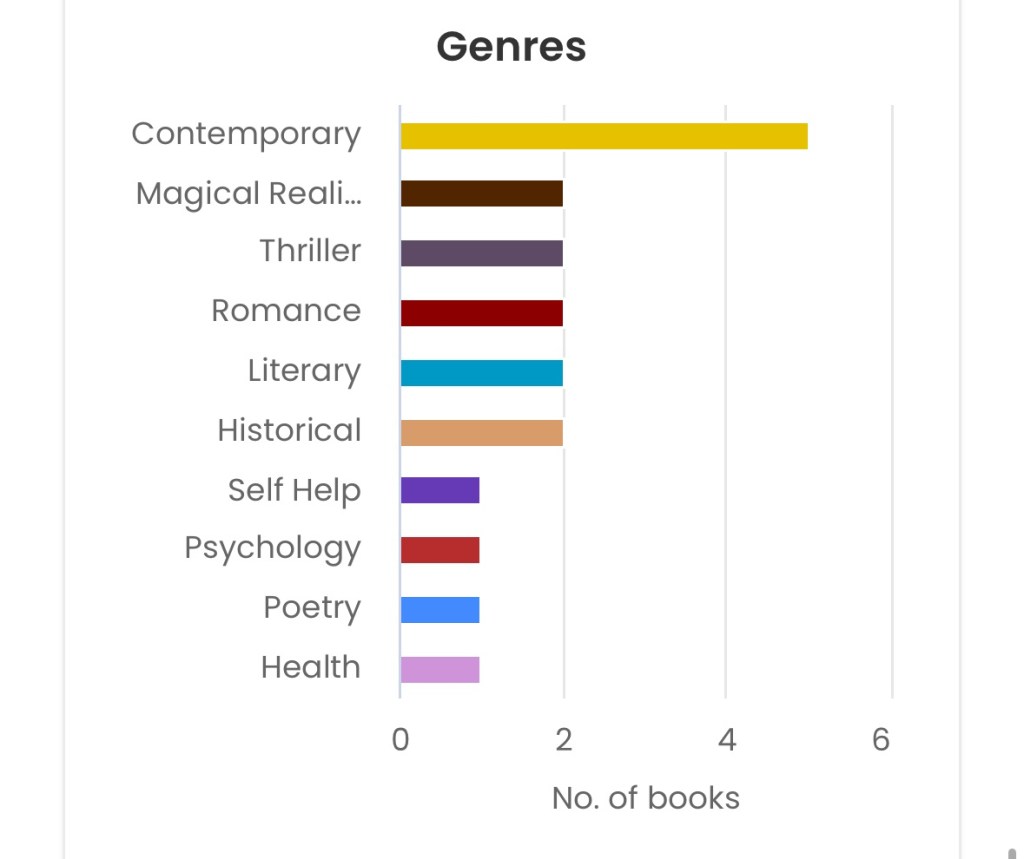 Genres: I’m definitely a lover of contemporary, magical realism, romance, literary, and historical fiction. I am surprised thriller is up there because I can guarantee that I did not read a scary book!