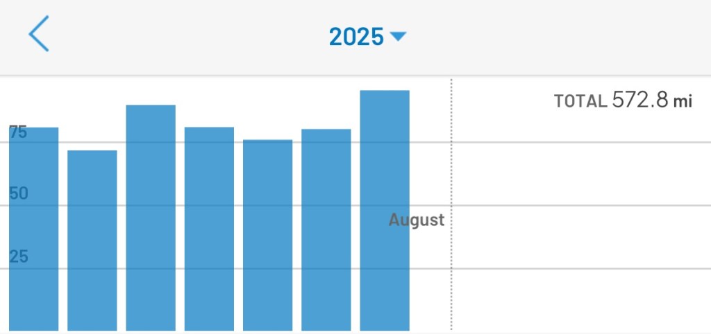 I’m starting to see that my goal of 1000 miles in a year is possible! At the end of July, I had walked 572.8 miles. This means I need to average 85.6 miles over the next 5 months. My average for the first 7 months of the year was 81.8, so it’s just 4 more miles a month. As long as I am tracking closely, I’ll be able to do it!